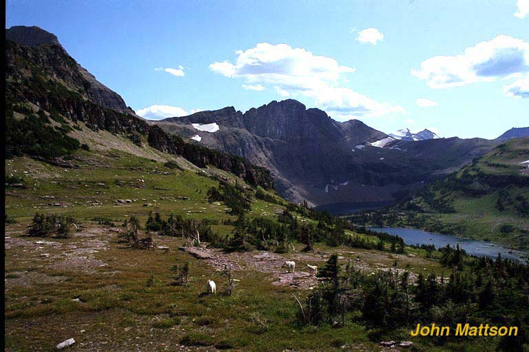 Where the continental divide and the "Going To The Sun Highway" cross is Logan's Pass. Here from the visitor's center and parking lot, one can take a wooden walkway to a scenic over view less than a mile a way. On this day a couple of mountain goats were grazing off the path.